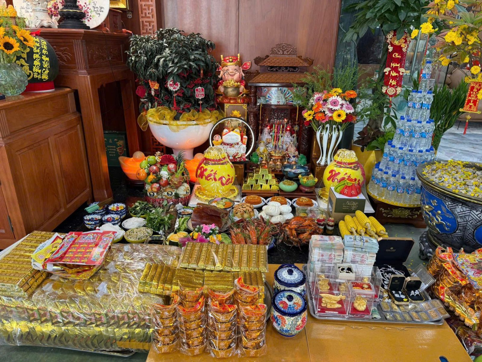 Mâm Cúng Vía Thần Tài có sử dụng Vật phẩm Bánh túi tiền Tài Lộc để lâu ngày do The Quin thiết kế